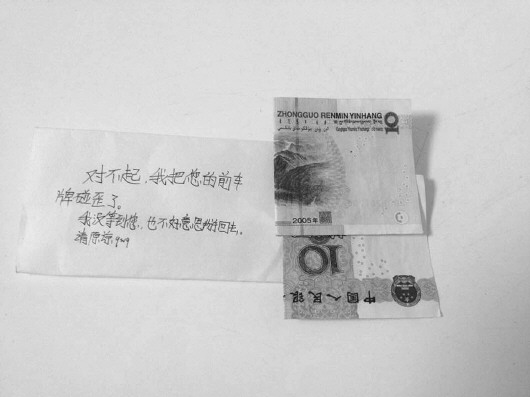 小男孩碰弯车牌后,在车的雨刷下留下一张纸条和20元钱。 见习记者 马雯雯 摄