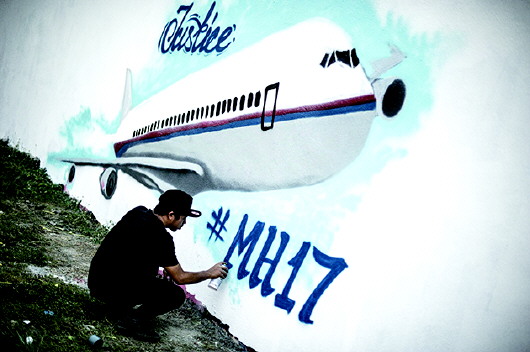 2014年7月24日,一名男子在马来西亚吉隆坡绘制一幅以马航MH17失事客机为主题的涂鸦作品。新华/法新