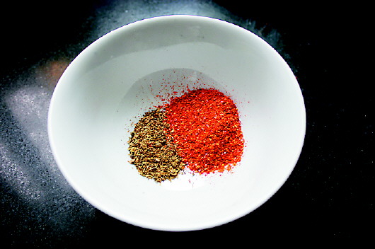 4、锅烧热,热些许油,随后将其浇至麻椒粉和花椒粉上,搅匀。