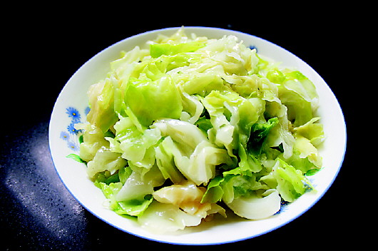 7、把烧好的辣椒油趁热倒在包菜上,搅拌均匀即可。