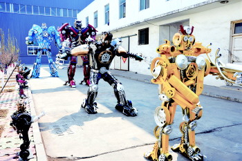 山东兖煤黑豹矿业装备有限公司,是一家集研发、生产、销售为一体的国家级高新技术企业。公司旗下铁艺公司以“变废为宝、节能环保”为宗旨,把废旧的工业零件焊接加工成一件件栩栩如生的钢雕艺术品,生产大中小机器人、车船模型等200余件,受到广大模型爱好者的追捧。图为正在展示的机器人。 本报通讯员 靖德超 王凯 摄