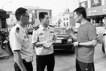 杨晓亮和队友回访一起盗抢车案件的受害者。 本报记者 王晏坤 摄