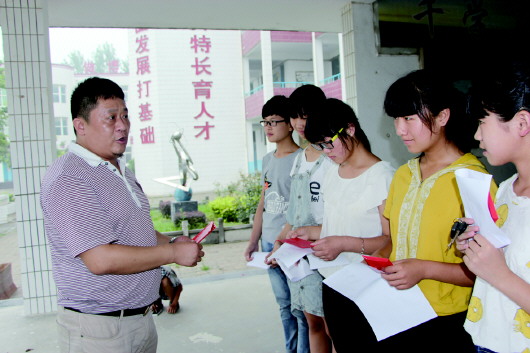 为了激励学生们努力学习,近日,巨野县核桃园镇一爱心企业负责人刘玉峰决定每年最少拿出4万元,奖励小学升初中、初中升高中的前10名学生,同时加大对优秀高考学生的扶持力度,特别加大对优秀贫困学生的帮扶力度,帮助他们顺利完成学业。图为:刘玉峰在为初中升高中的前10名学生颁发奖学金。
