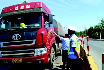 16日,青岛开发区交警正在盘查一辆危化品运输车。