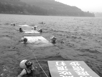 16日,泰安市体育总会联合泰安市游泳协会发起横渡天平湖活动。36名游泳爱好者参与横渡,往返距离约5000米。 本报记者 胡阳 摄