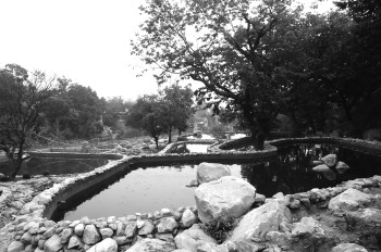 泰山螭霖鱼养殖示范基地位于村子南头,现在已经基本建成完工,只剩最后的路面修整和景观提升。大大小小的鱼池呈圆形或方形,依托山势依次排列,逐渐抬高。