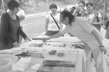 16日上午,记者来到新泰市莲花山风景区的莲花大酒店,几位书法家和画家正在现场即兴作画,引来不少市民围观。“我是一名书法爱好者,家里收藏了不少名字名画,可在路边上现场作画还是第一次见到。”市民翟先生说。