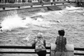 16日,幸福门海面掀起近两米高的大浪,吸引了不少游客驻足观看。伴随大风,17日气温有所降低。