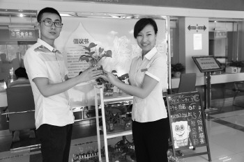 工作人员向客户赠送盆栽。谢晓丽 摄