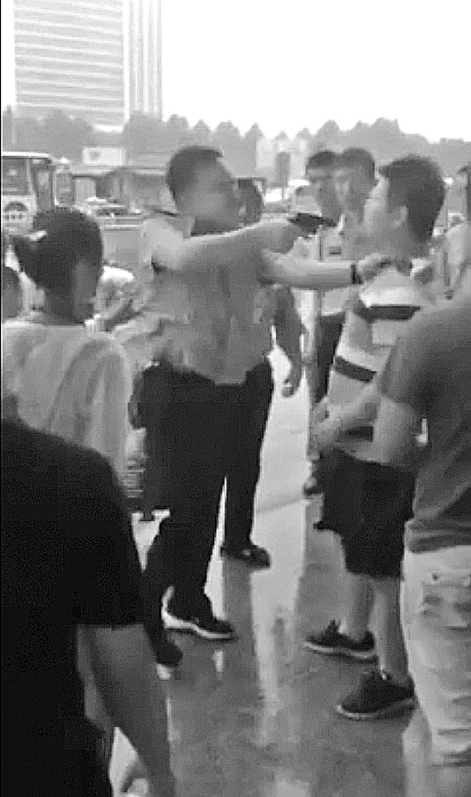 本报临沂7月20日讯(记者 高祥) 20日上午,有网友爆料称,有人在临沂汽车站拍到惊人一幕:几名警察执法时与一男子相互推搡,最后该男子被警察拿枪指头,但具体原因不明。记者20日从临沂市兰山公安了解到,事发时,当地派出所民警正在对非法募捐行为进行处警。