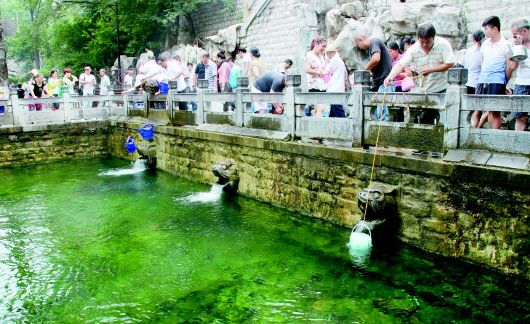 20日,随着地下水位的回升,黑虎泉的三个兽头全部恢复喷涌状态,不少市民排队从兽头处接水。在此前的14日和15日,黑虎泉西侧兽头一度暂停喷涌。 本报记者 周青先 摄