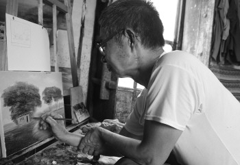 韩金石是一名孤独的画者,在无声的世界里艰难地坚持着绘画,即使在最困难的时候也没有丢下画笔。他的画是跟当时在文化馆工作的姐夫张振鲁学的,1986年前后,姐夫去世,韩金石唯一的老师也没有了。多年前的知青朋友们离开乡村后,在偏远的农村,他彻底失去了能在创作上交流的朋友。
