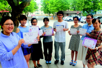 20日,青岛17中美术班8名考入清华大学的毕业生展示他们的录取通知书。今年,17中美术班学子们考出了近年来最好成绩,张文赫、杨颖、赵雁南、王宸等8人考上清华大学,还有中央美院9人、中国美院7人、江南大学38人,两个美术班的百名学生中90余人被艺术提前批次重点大学录取。