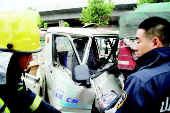 本报7月20日讯(记者 周衍鹏) 19日,城阳区前旺疃加油站南侧发生一起严重交通追尾事故,一辆小型货车与一辆大型半挂车追尾,货车车头严重变形,司机受伤被困。城阳消防大队春城路中队官兵历时近半个小时紧急救援,最终破拆车体后将受困司机救出,并送往医院救治。