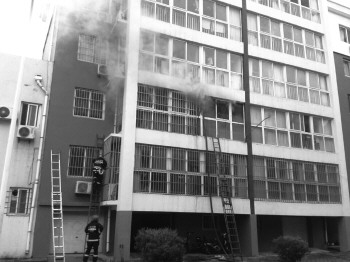 消防人员正通过梯子进入失火房间。 本报记者 摄