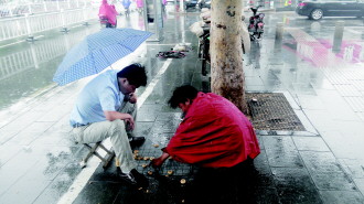 时间:2015年7月16日 自述:尽管雨下得很大,两位棋友一个打伞,一个披雨衣仍在路边专注地对弈。 点评:反正是下雨了,下会棋再走,兴许雨过一会能停呢。
