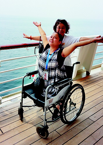 已是一个8岁孩子的妈妈,在邮轮上的她尽情释放着积蓄已久的能量。在邮轮卡鲁索大剧院,喜欢唱歌的她与旅意歌唱家栾峰开心地交流、合影;10层的邮轮,几天时间里,赵亦静几乎走遍了每一个角落。在自助餐厅,她与来自印度的服务员成了朋友;在甲板的诗朗诵会上,她的乐观开朗也引来众人合影。当最后一天的船长鸡尾酒会开始时,坐在轮椅上的赵亦静身着一身粉红色礼服现身,挂着满脸的自信。“几天的旅行,虽然有些累,但没有什么遗憾,途中没有了牵挂,没有了烦恼,旅途中,感到我们不再是残疾人。”