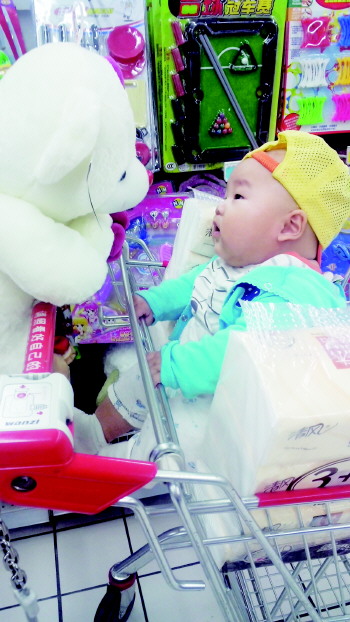 情景描述:小宝宝心里大概在想:大熊,咱俩谁个儿大呀?