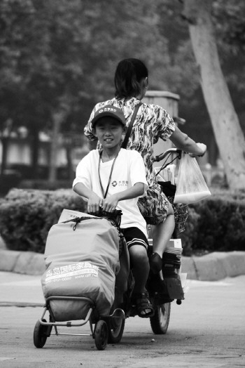 妈妈用电瓶车带着何嘉辉,拉着300份报纸去卖报。