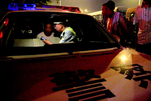 交警对一司机检测血液酒精含量。 本报记者 袁文卿 摄
