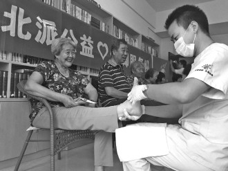21日,来自北派公益服务队的10余名技师带着专用修脚工具到古岭社区,为社区老人免费修脚。