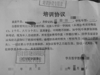 培训协议上面写到,“自愿接受驾校入学受理手续,注册入学后一学到底(从理论考试合格起C1:2个月、大车:3个月),直到拿证;中间绝不间断,如中间不来参加训练和考试,视为本人自动放弃,所有交款费用作废(学籍注销),因学员延误导致驾校名额指标不能按时使用,给驾校造成的损失(暂按每月3600元计算损失),一切后果由学员全部承担”。该市民表示,该协议提到的“学习过程中绝不间断,如中间不来参加训练和考试,视为本人自动放弃”的款项让人感觉有些荒唐。而且,他认为即便有该协议,工作人员也应在交费前就进行说明。
