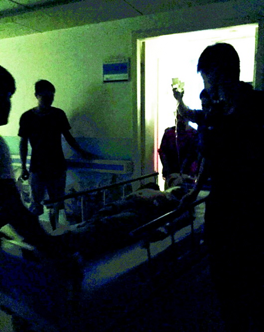 23日晚8时46分,无棣县人民医院,一位昏迷的交警被推出病房,疑似去做检查。 本报记者 摄