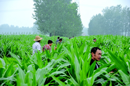 7月23日,嘉祥县5000警民出动,寻找失踪的张子祎和张诗晨。图为搜寻人员在玉米地中拉网排查。 本报记者 李岩松 摄