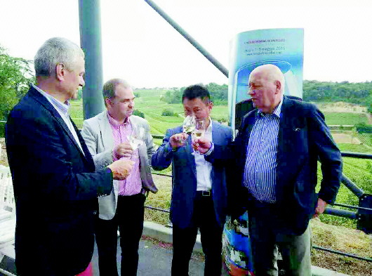陈春萌和欧洲的葡萄酒专家交流。左为布鲁塞尔国酒酒类大赛主席杜安,右一为前拉菲酿酒师热拉尔。