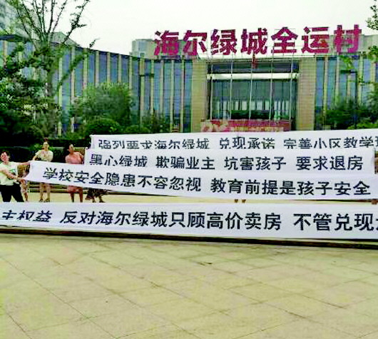 近些年,学区房成了地产商销售新楼盘吸引购房者的一张“王牌”,但是“王牌”的背后往往蕴藏着许多陷阱,市民花重金之前可一定要多长点心。近日,海尔绿城全运村业主在售楼处门口拉起横幅进行维权,抗议开发商在没有通知业主的情况下,把之前承诺的“燕山学校分校”改成了“龙奥学校”,并且学校教室超员40%,严重挤压了孩子的活动空间,给孩子造成了很大的安全隐患。