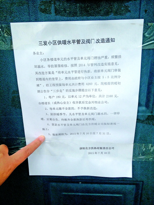 17日上午,记者来到三发小区,看到各个单元门口均贴有“三发小区供暖水平管及阀门改造通知”,通知写到:按照2014年管网改造方案,将该小区单元水平管进行换新,将新单元阀门移装到楼道内的竖管上,费用由政府和小区业主按5:5比例分摊,经工程预算每单元共计费用4260元。