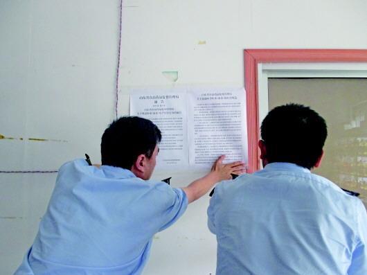 执法人员正在张贴《关于规范虾米(海米)生产经营行为开展集中查处行动的通知》和《关于规范虾米(海米)生产经营行为的通告》。 封立荣 刘世雄 摄