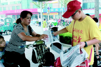 23日,本报“九龙家电杯”暑期营销秀进入第三天,小选手们褪去头两天的陌生与羞涩,勇敢地营销手中的报纸。选对好地点、规划卖报路径、自制推车卖报装备……熟练了卖报流程的小选手们发挥各自的营销妙招,完成当天的任务。图为一名小选手向等红灯的市民推销报纸。