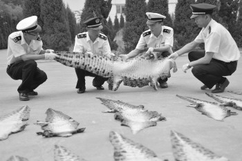 23日,青岛海关下属烟台海关与烟台出入境检验检疫局联合执法,对查获的一批非法进境濒危动物制品鳄鱼原皮进行集中销毁,共销毁未经鞣制的鳄鱼原皮20张,重约20公斤,货值60余万元。该批鳄鱼原皮由一名搭乘韩国仁川至烟台航班的韩国籍旅客随身携带。