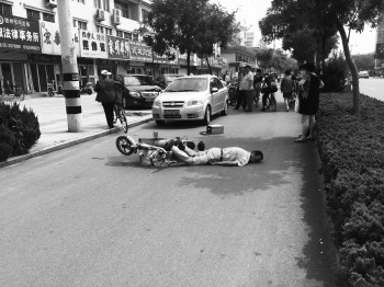 7月23日下午2时许,在湖滨大道与大学路交叉口北200米处,一名骑电动车男子在行驶中突然摔翻在路,擦伤面部。据男子称中午喝多了导致车辆失控摔倒在地。 本报记者 张磊 摄