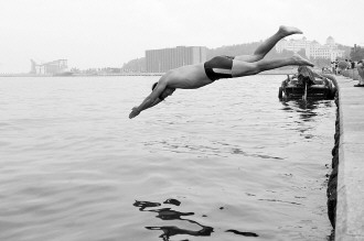 23日,几名小伙在在幸福公园岸边跳水游泳。当天最高气温28℃,空气湿度较大,有点闷热。24日,多云间阴有雷雨或阵雨,南风4~5级,温度23℃~27℃。