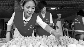 ▲东方福爱心联盟的志愿者为文登社会福利中心的老人们包饺子。 记者 刘洁 摄