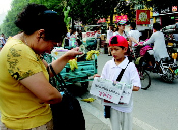 主动向路人推销报纸,对7岁的小报童朱柯翰来说已不是难事。 本报见习记者 李洋 摄