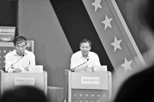 在26日的电视问政中,济南市城管局局长田德昌回答提问。 本报记者 王媛 摄