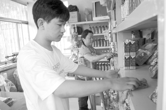 平时焦中锐打半天工,在家时就会帮着行动不便的妈妈整理货柜。 本报记者 王光营 摄