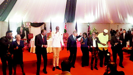 25日晚,美国总统奥巴马(中)在肯尼亚出席一个活动时兴致颇高,当众秀了一段舞蹈。