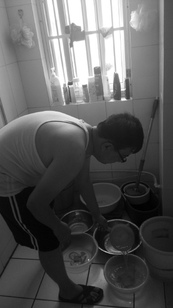 “终于来点水了,跟抗战胜利了似的,不过这次停水,我们家立了家规,谁在家浪费水,罚做家务一周。”家住中央丽景的丁先生一家四口人住在一起,此次停水可让他们遭不少罪。无水洗澡洗头,衣服堆了一堆还没洗。平常孩子浪费水严重,为此,丁先生立了一个新家规。