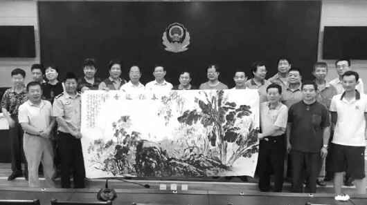 25日,滨州市文联、美协“迎创城,进警营”走进滨州市公安局交警支队开发区大队开展庆八一官兵慰问活动。滨州市18位书画家现场创作书法、山水、花鸟作品近30幅送官兵。