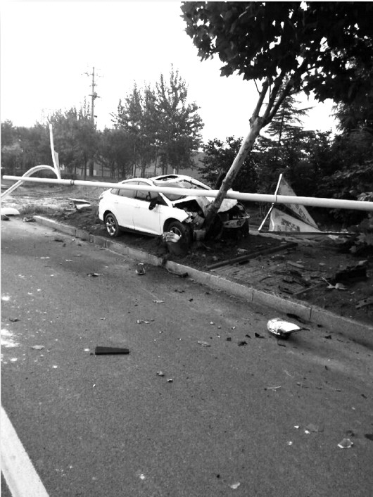 26日早上四五点钟,黄河五路渤海三十路以西,一辆白色轿车由东向西行驶的过程中,撞倒了路灯杆之后又连续撞断两棵树,最终被第二棵树卡住停了下来。据现场图片显示,轿车前面已经严重变形。