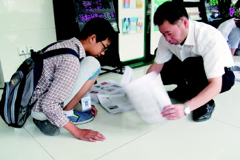聊城市邮政报刊零售局局长翟继峰在教小报童陈延旭合报纸。
