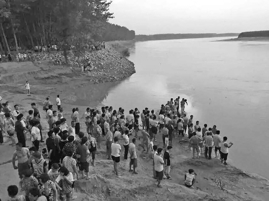 在水里的5位同伴受到惊吓后赶紧逃到岸上。“有5个孩子坐在岸边不说话也没动静了。”俩男孩溺水时,董先生恰巧在河边的堤坝上乘凉,赶紧掰下一段杨树枝,沿着河岸向小佳跑去。无奈水流太大,小佳很快被冲远。而且黄河岸边的护坡石陡峭,董先生没能靠近小佳。被水冲走百十米后,小佳便没了踪影,再也没有露出水面。