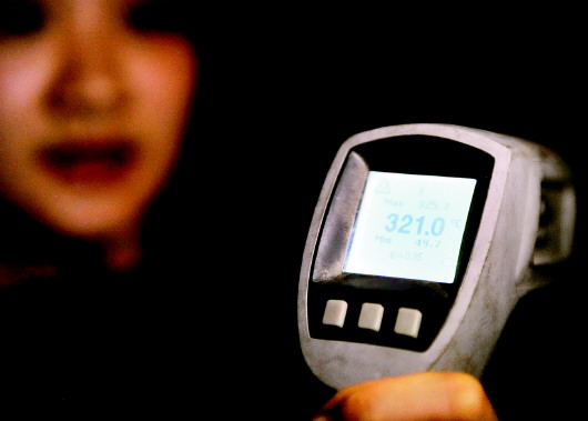 钢水罐到底有多热呢?工作人员拿来一支测温枪,远远对着钢水罐测了一下,300多摄氏度的高温把记者吓了一跳。站在离钢水罐大约5米的地方,巨大的热浪让记者根本不敢再靠近,但工人们作业的时候与钢水罐的距离仅有大约半米。