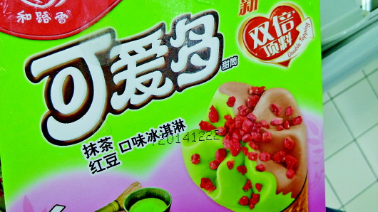 从超市里的情况看,多数雪糕的生产日期都是今年的四五月份,不过也有少数雪糕是去年的。比如,一款和路雪的“可爱多”抹茶红豆口味甜筒,日期标注是2014年12月22日。在环山路上的统一银座内,一款和路雪香草草莓口味雪糕是2014年6月生产的,到现在已经有一年多。