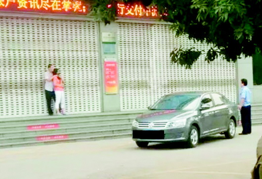 案发现场位于中心大街的一个金融网点,嫌疑人右手拿着一把刀子放在女受害人脖子处,左手按住了女子的右手。两人处在台阶之上,背靠着该网点的卷帘门。由于地处闹市区,现场围观群众非常多。