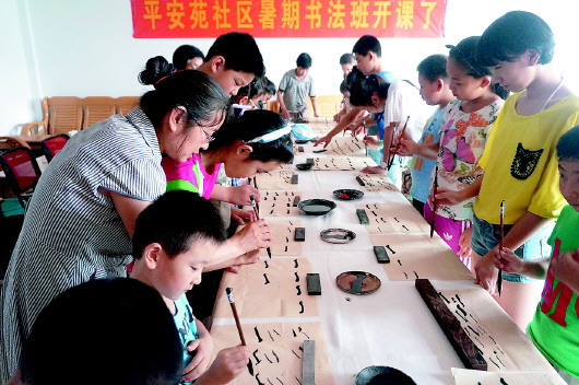 本报讯(记者 肖龙凤 实习生 朱灿 通讯员 袁铭) 7月21日下午,平安苑社区公益书法班正式开课了,尽管天气炎热,但同学们都早早地来到社区。